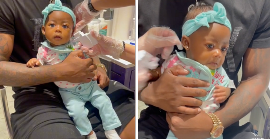 Bebu su posjeli njezinom ocu u krilo. Sa znatiželjom je gledala oko sebe. Nakon što su joj probušena oba uha, briznula je u plač. Mama je kasnije rekla da bi to ponovno učinila, bez obzira na to koliko joj je bilo teško čuti djevojčicu kako plače.