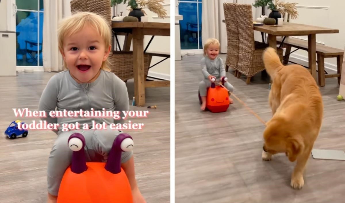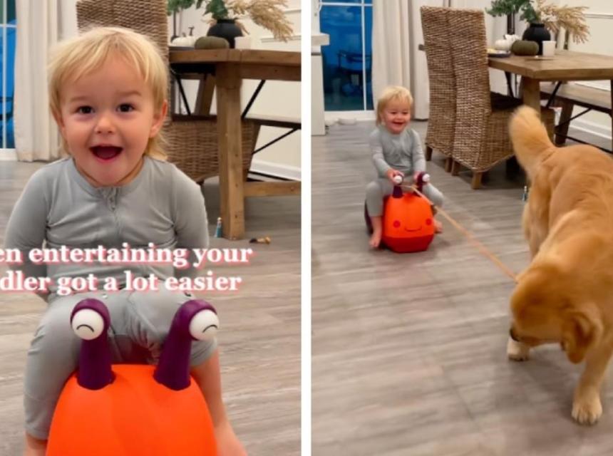 JEDNA mama sjetila se kreativne ideje kako da istovremeno zabavi svog malenog sina i psa, zlatnog retrivera Rileyja. Dok se njezin sin nalazio na igrački vozilu za djecu, njegova mama je oko vozila stavila uže, a drugi dio dala Rileyju. Slatkom psu nije dugo trebalo da počne povlačiti uže, a time i dječaka.