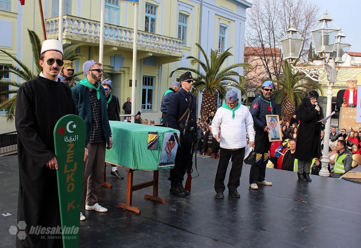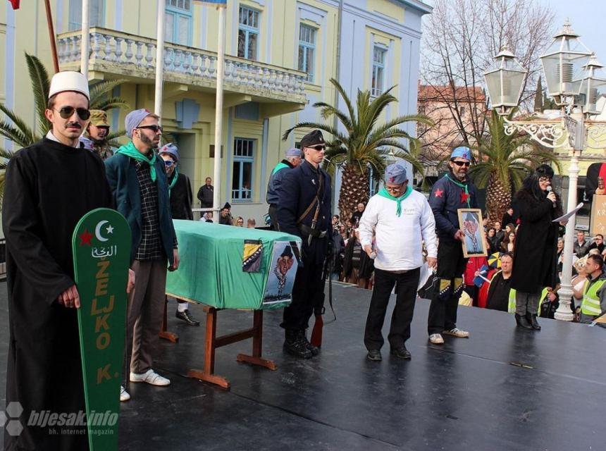 Najviše pažnje privukao je tabut s nišanom na kojem je stajalo ime "Željko K.", jasna aluzija na bivšeg člana Predsjedništav BiH Željka Komšića. Pored tabuta su stajali partizani sa zelenim maramama, te ustaša i imam.