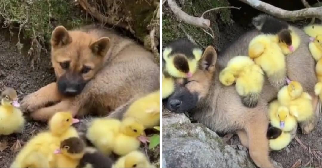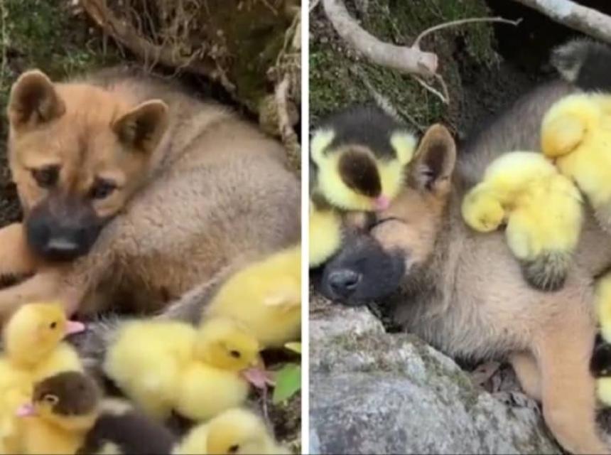 Na snimci, koja je pregledana gotovo pet milijuna puta, štene prilazi pačićima, namješta se, legne i promatra ih.