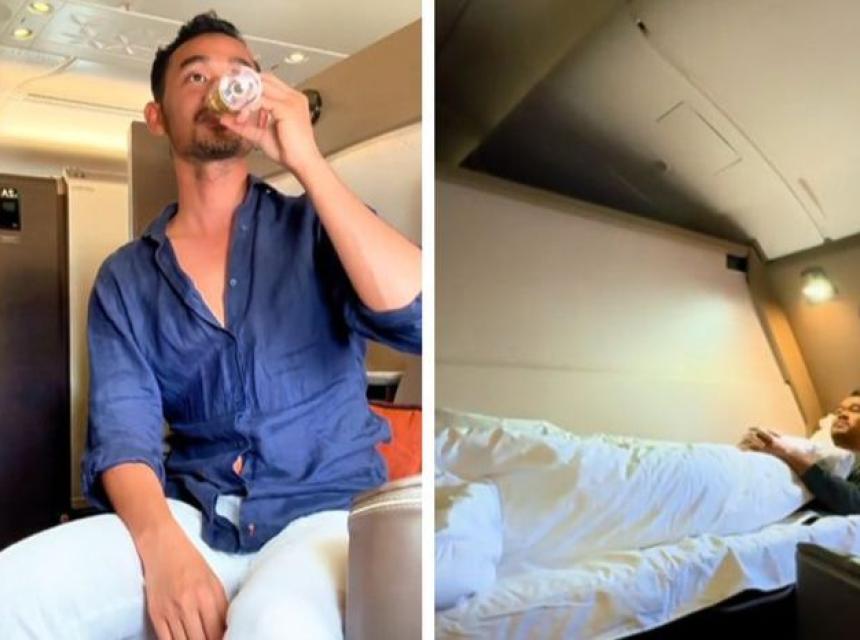 Na početku snimka vidimo kako ulazi u ogromni Erbas A380, gdje ga dočekuje ljupka stjuardesa. Ona mu je pokazala gdje da se smjesti, a prostor će vas raspametiti.