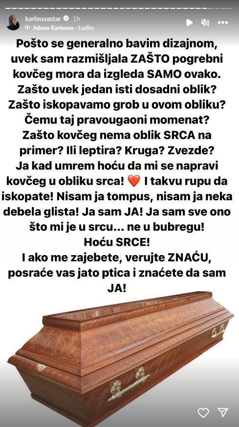 Pjevačica Jelena Karleuša mnoge svoje fanove ostavila je bez teksta svojom posljednjom objavom. Naime, populara Diva dotakla se teme smrti i sahranjivanja ljudi, te je napisala: