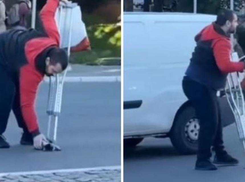 Muškarac se, oslonivši se na štake da održi ravnotežu, sagnuo i podigao mačića s ceste te ga pomazio, a predivan prizor snimili su slučajni prolaznici iz automobila s druge strane ulice.
