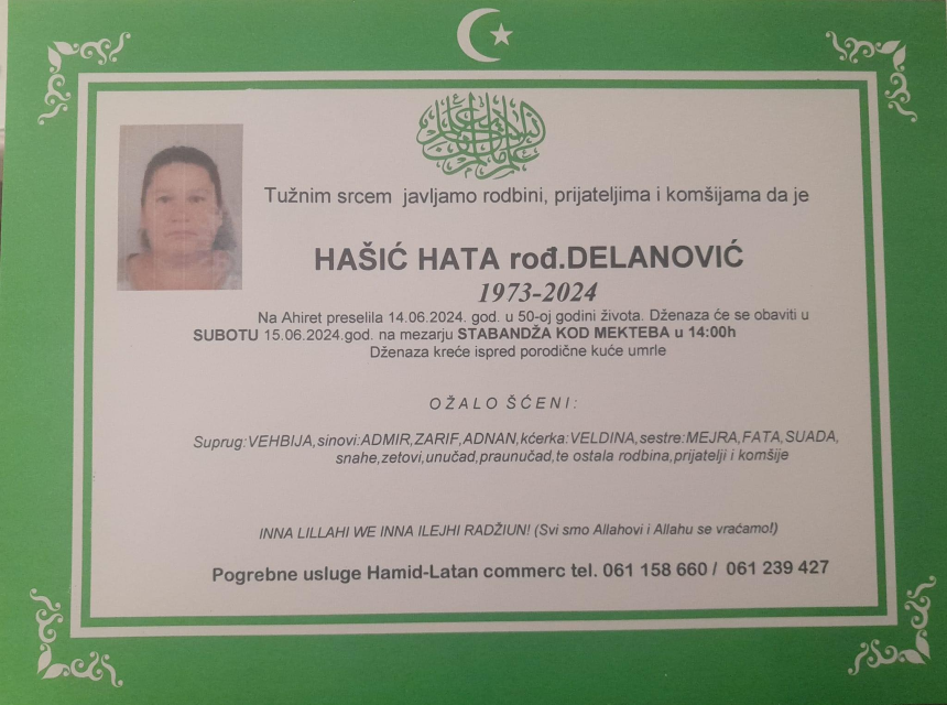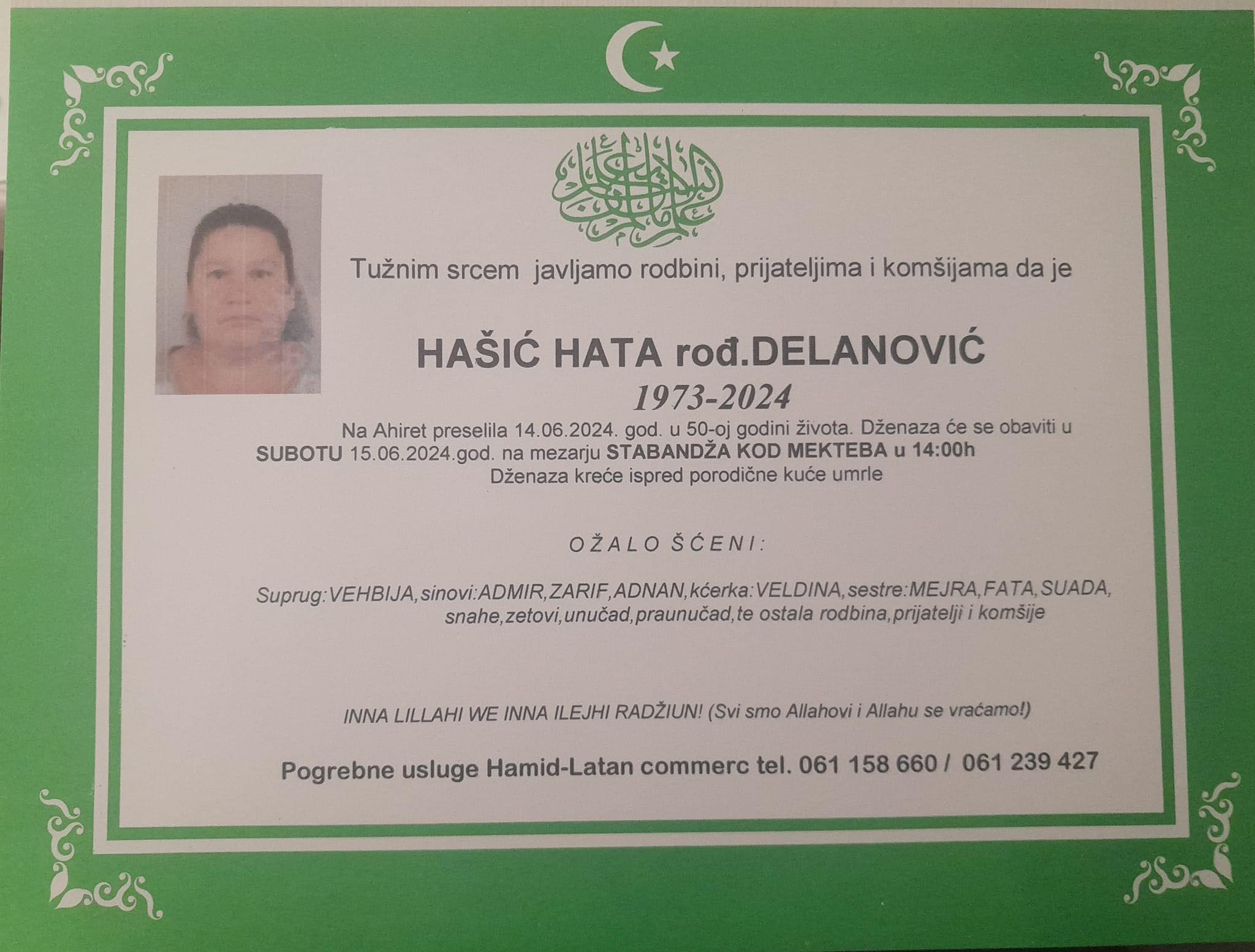 Tužnim srcem javljamo rodbini, prijateljima i komšijama da je Hašić Hata rođ.Delanović na Ahiret preselila 14.06.2024.god. u 50-oj godini života.