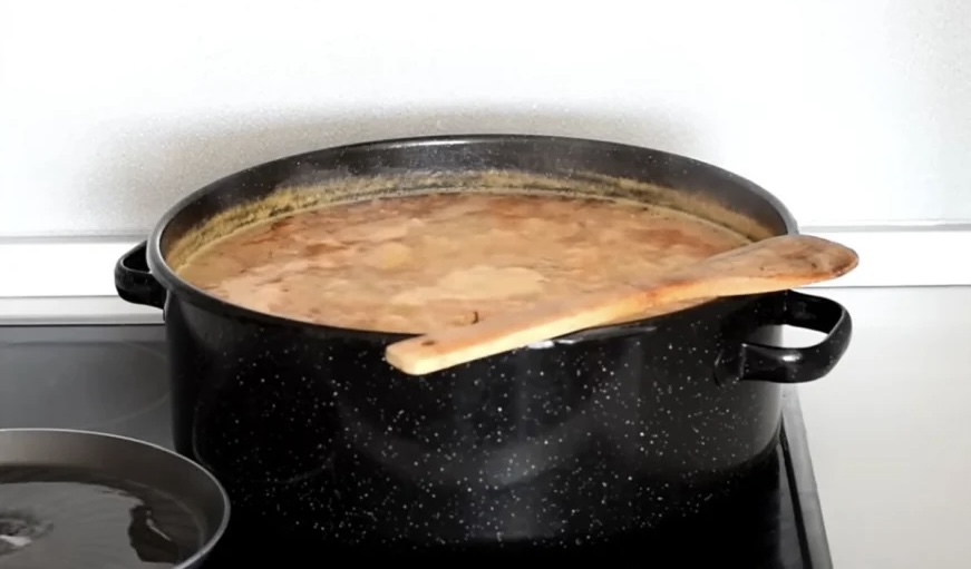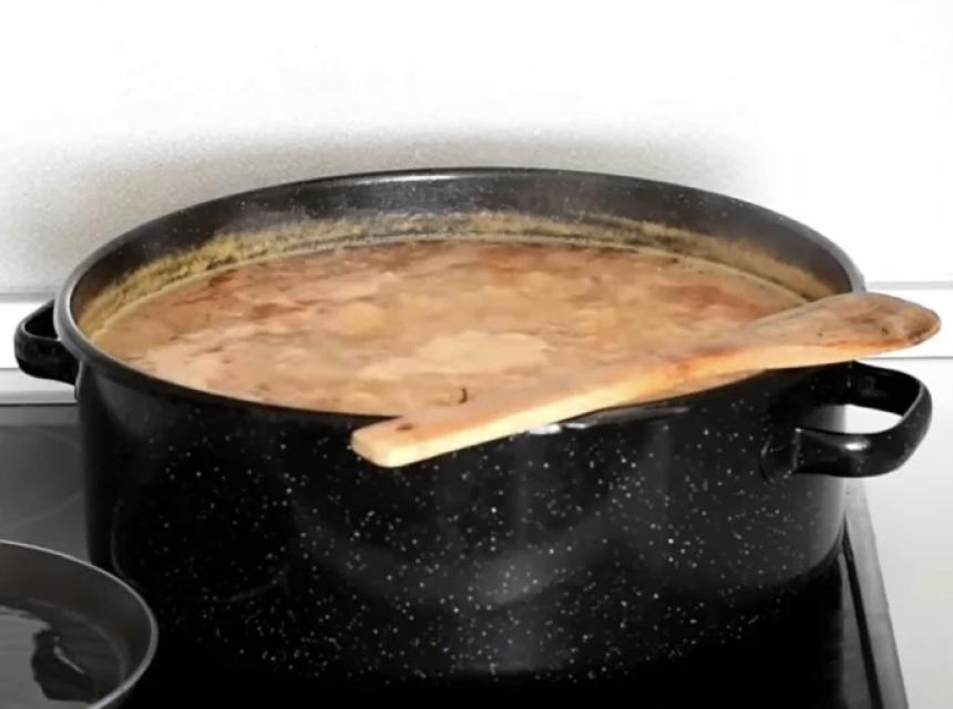 Zatim iscijedite vodu u kojoj je natopljen grah, a grah stavite u odgovarajuću posudu; prelijte ga hladnom vodom da potone i kad provri, kuhajte još 10-15 minuta, pa vodu iscijedite i prelijte grah vrelom vodom. Tu dodajte dodati polovinu sitno isjeckanog crnog luka i ostavite da se krčka uz povremeno dolijevanje tople vode.