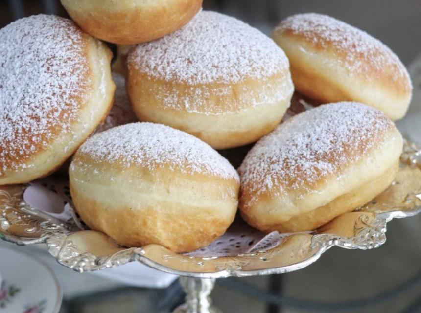 U mlako mlijeko (600 ml) izdrobiti kvasac, staviti 2 kašičice šećera i ostaviti da nadođe. Za to vrijeme, u većoj posudi umutiti 2 žumanca, dodati ulje, šećer, so pa na kraju kvasac. Sve umiješati pa postepeno dodavati brašno i mutiti. Zamijesti tijesto srednje mekoće (važno da se ne lijepi za ruke i radnu površinu). Takvo tijesto ostaviti da odmori 20-30 minuta. Poslije tridesetak minuta tijesto ponovo malo premijesiti bez dodavanja brašna i rastanjiti na debljinu manju od 1 cm (od prilike 7-8 mm). Čašom vaditi krofne, pa ostaviti da odstoje sa svake strane po 5 minuta. Za to vrijeme zagrijati ulje na umjerenoj temperaturi. Prije prženja krofne još malo blago rastanjiti oklagijom i ostaviti da malo odmore. Kada se krofne stavljaju u ulje bitno je da ona strana koja je bila na stolu sada bude gore. Gotove krofne uvaljati u prah šećer i poslužiti tople.