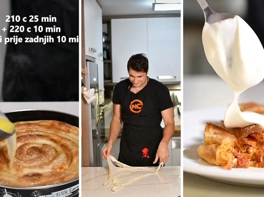 Potom je razvukao jufku za pitu, dodao je fil te smotao. Pekao ju je na 210 stepeni 25 minuta te potom na 220 stepeni 10 minuta. Prije posljednjih 10 minuta treba preliti pitu mješavinom istopljenog putera i vode.