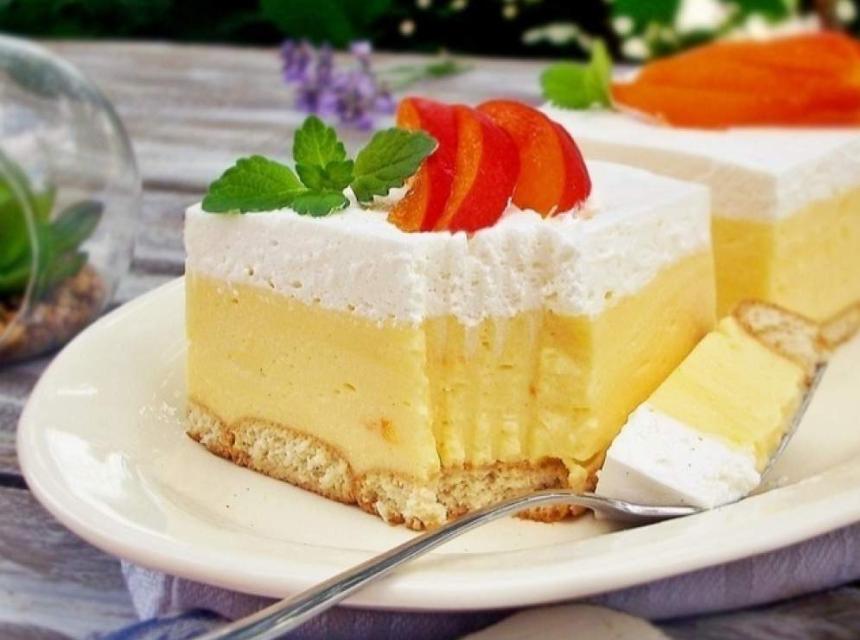 4. Stranice kalupa obložiti papirom za pečenje. U zdjelicu sipati mlijeko, natapati keks i redati u kalup. Preko keksa rasporediti fil, a zatim šlag i sve poravnati. Ostaviti kolač na hlađenje, najbolje preko noći. Rezati na kocke i poslužiti uz svježe kajsije, piše Avaz.