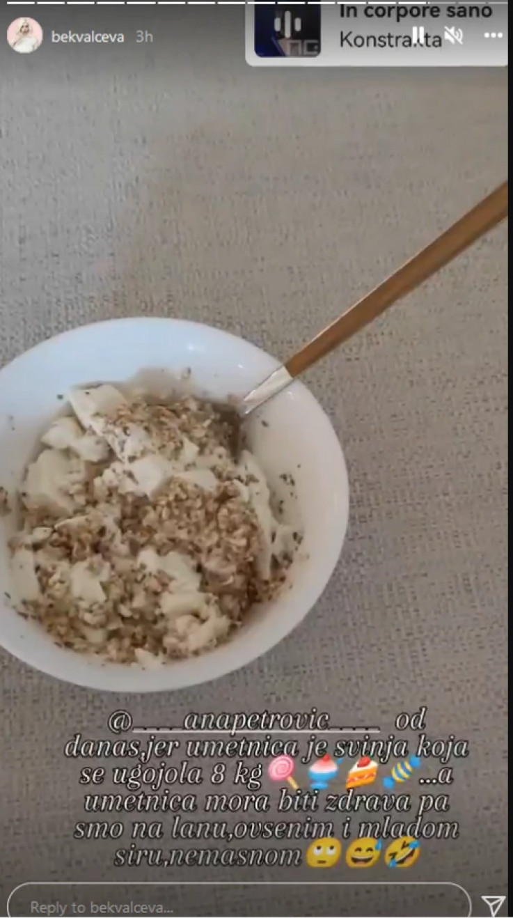 - Od danas na režimu iskrane. Jer umjetnica je svinja koja se ugojila 8 kilograma, a umjetnica mora biti zdrava, pa smo na lanu, ovsenim pahuljicama, mladom siru i mladom siru nemasnom - napisala je Nataša Bekvalac na svom Instagram storyju.