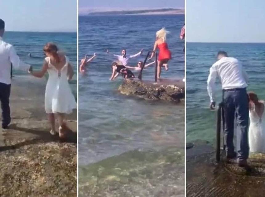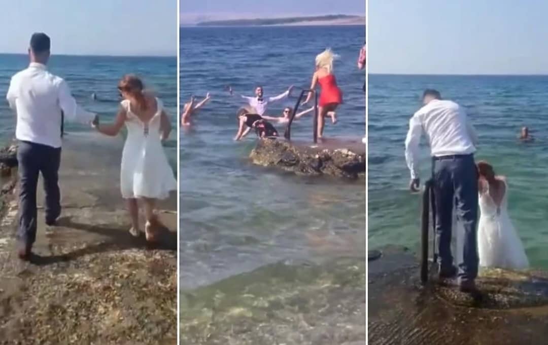Snimak koji je objavio Večernji.hr prikazuje mladence i dio gostiju koji su se odlučili proveseliti se tako što su na plaži Bobovik skočili u more.