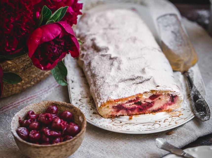 Sastojci: 2 jogurta, 1 vanilin šećer, 1 prašak za pecivo, 1 dcl ulja, 300 g griza, 200 g šećera, 1 pakiranje kora za savijače, 1 kg trešanja, korica limuna.
