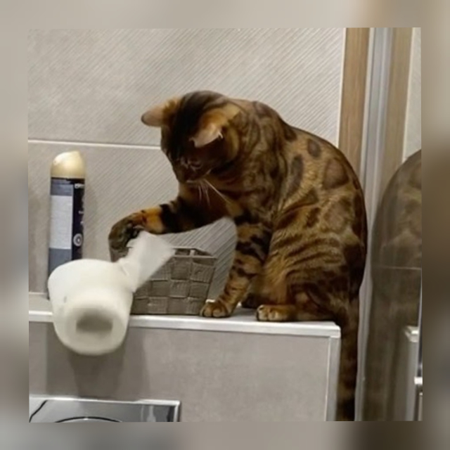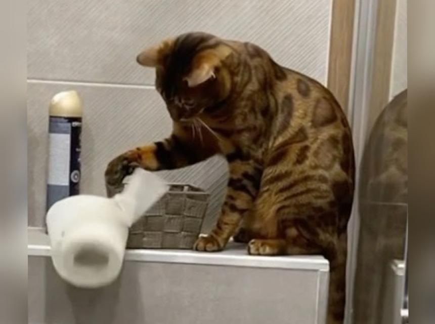 Mačak Leo popeo se na policu iznad WC školjke i odlučio napraviti nešto drugačiji raspored. Redom je počeo rušiti papir, zatim košaricu pa i osvježivač zraka.