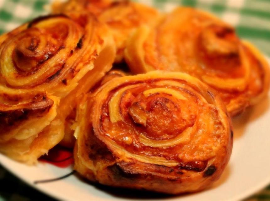 Tijesto razvaljajte u veći pravokutnik i premažite kečapom. Nemojte koristiti umak od rajčice jer će iscuriti. Na vrh dodajte sir, šunku i origano. Zarolajte i režite na komade debljine jedan centimetar.