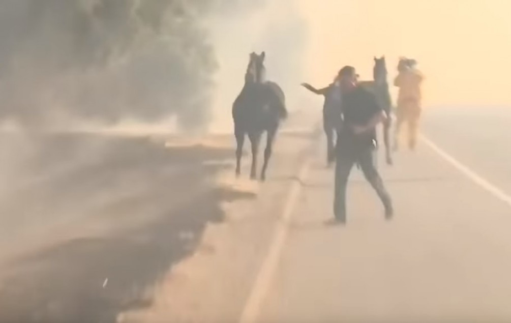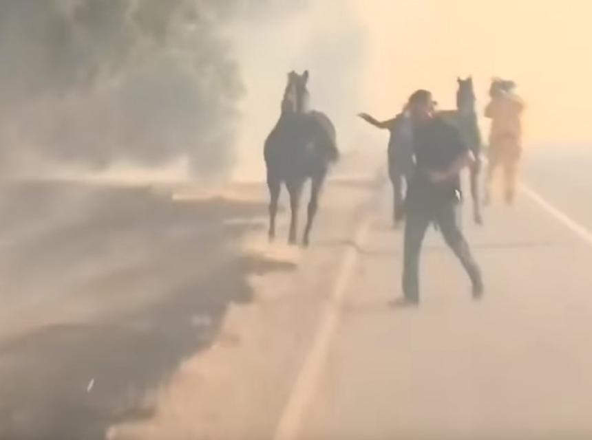 Na snimku se vidi kako se konj, kojeg su iz vatre spasili vatrogaci, okreće i vraća u opasno područje da bi pomogao druga dva konja, od kojih je jedan još vrlo mlad, da izađu na sigurno.