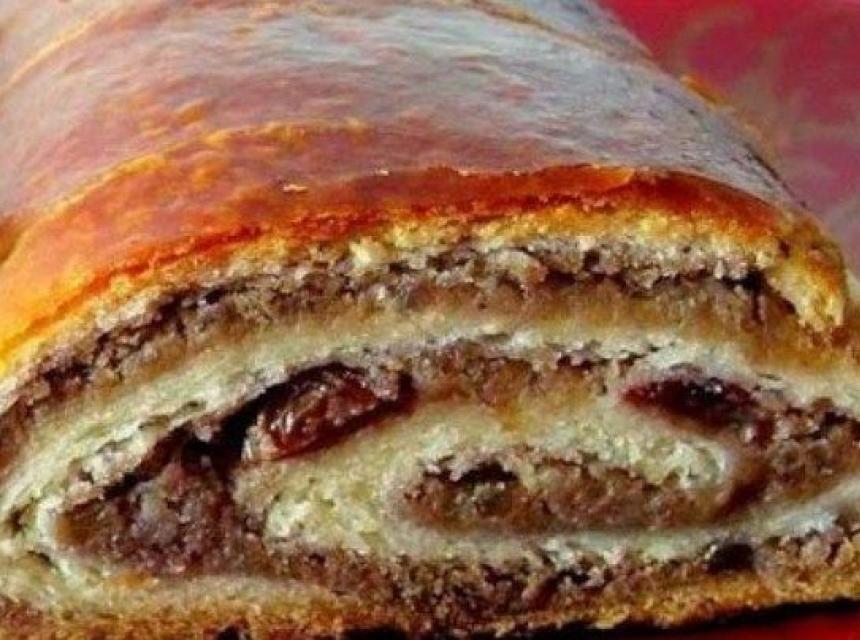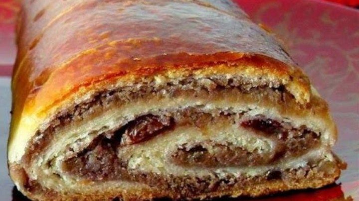 Zamijesite glatko tijesto koje se neće lijepiti. Prekrijte ga plastičnom folijom i ostavite da udvostruči zapreminu. Sameljite orahe pa ih prelijte vrućim mlijekom, dodajte šećer, grožđice i cimet i dobro izmiješajte.