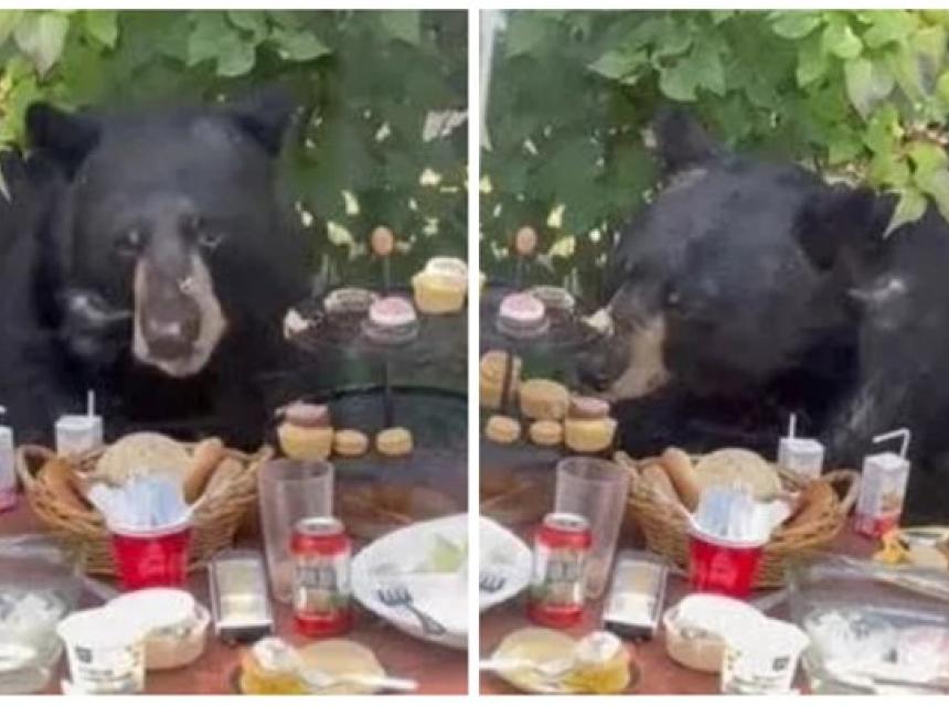 Rauf i Laura Majidian snimili su velikog medu kako je došetao iz šume počastivši se kolačićima namijenjenima za goste rođendanskog slavlja njihovog dvogodišnjeg sina. Gladni se medvjed sam poslužio kolačićima, no kruh i ostale namirnice nije ni taknuo.