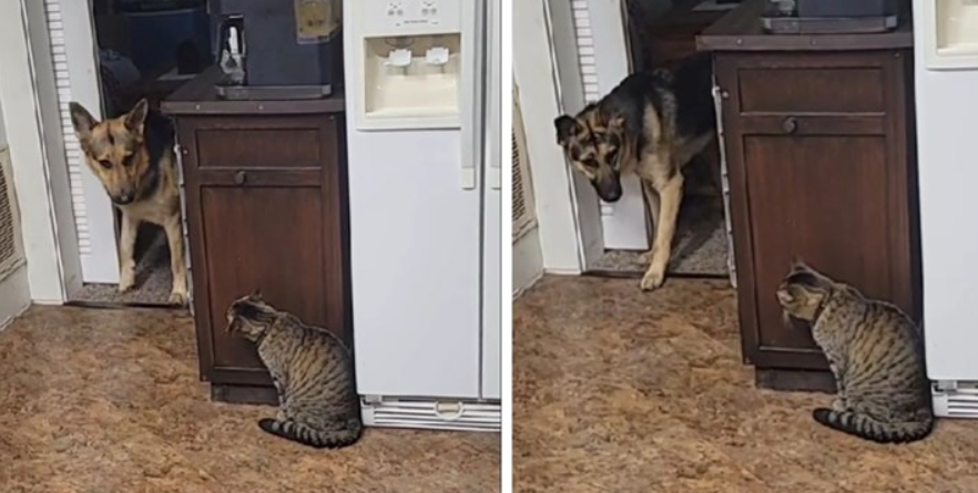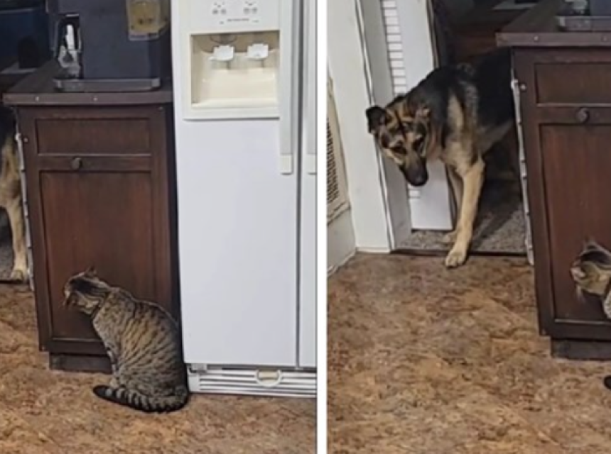 Par njemačkih ovčara htio je krenuti u šetnju, no prolaz im je blokirala mačka koja se nije htjela pomaknuti s mjesta. Na snimci se vidi kako psi vire iz sobe dok mačka vreba iza ormarića, a nijedan od njih nije bio spreman na okršaj s njom.