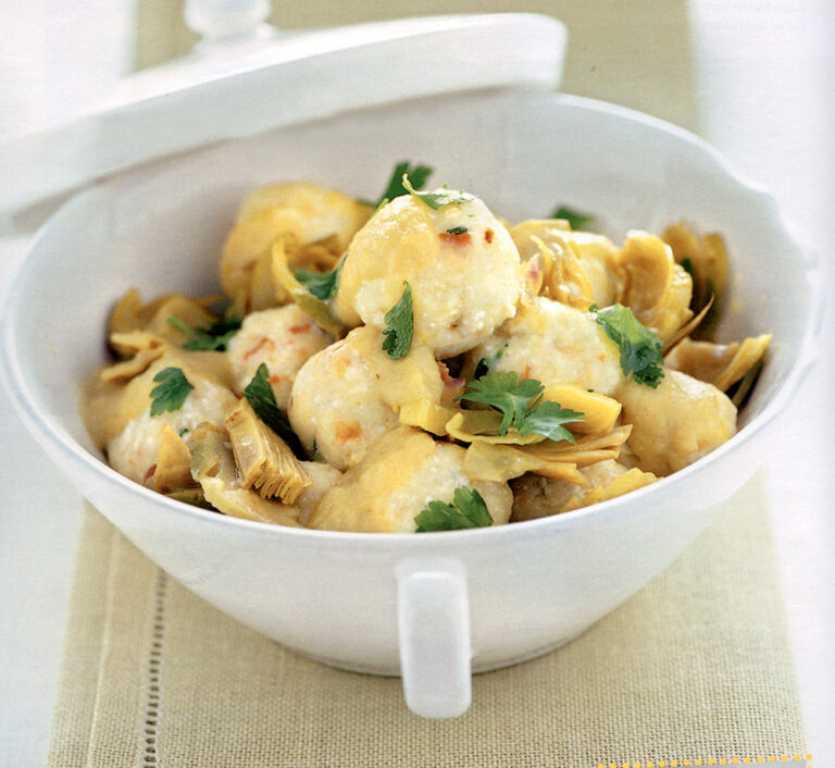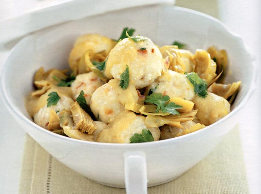Priprema: artičoke očistiti, razdvojiti na listiće i potopiti u vodu zakiseljenu limunovim sokom. Prasu očistiti, sitno isjeckati i kratko propržiti na pola količine putera. Dodati artičoke, pržiti 2-3 minute, pa usuti supu, pola količine peršuna i pržiti pokriveno desetak minuta. Kratko izmiksati, dodati 10 g brašna razmućenog s dvije kašike hladne vode, te umak kuhati na laganoj vatri oko 5 minuta. Luk i šunku propržiti na preostalom puteru, dodati peršun i sve izmiksati. Dodati brašno, sir, žumanca, parmezan i malo soli, umijesiti vlažnim rukama i oblikovati njoke veličine oraha. Kuhati ih u dosta vode dok ne isplivaju na površinu, procijediti i poslužiti s umakom.