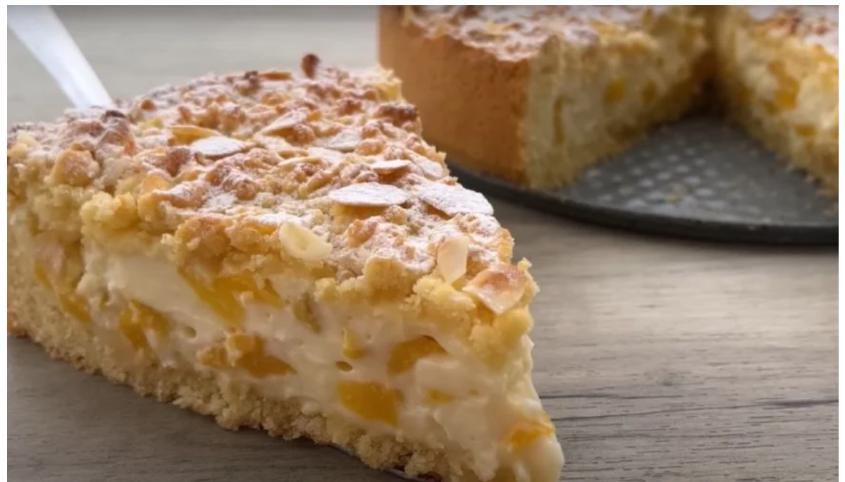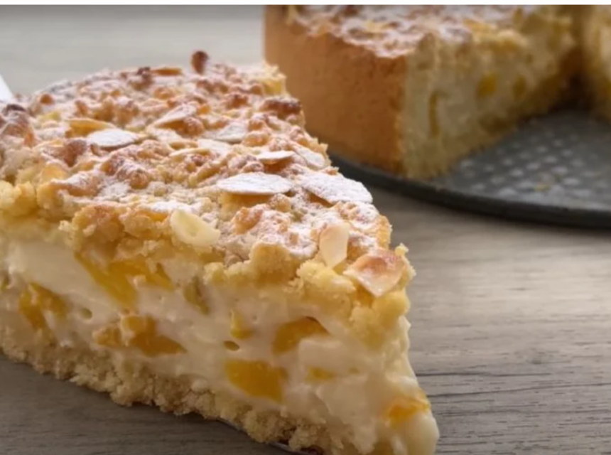 5. Prebacite kremu na tijesto u kalupu pa zagladi. Po kremi naribajte tijesto iz zamrzivača. Po tome pospite listiće badema. Pecite u pećnici prethodno zagrijanoj na 180-200 stepeni, oko 25 minuta. Izvadite tortu iz pećnice i kalupa te pospite šećerom u prahu.