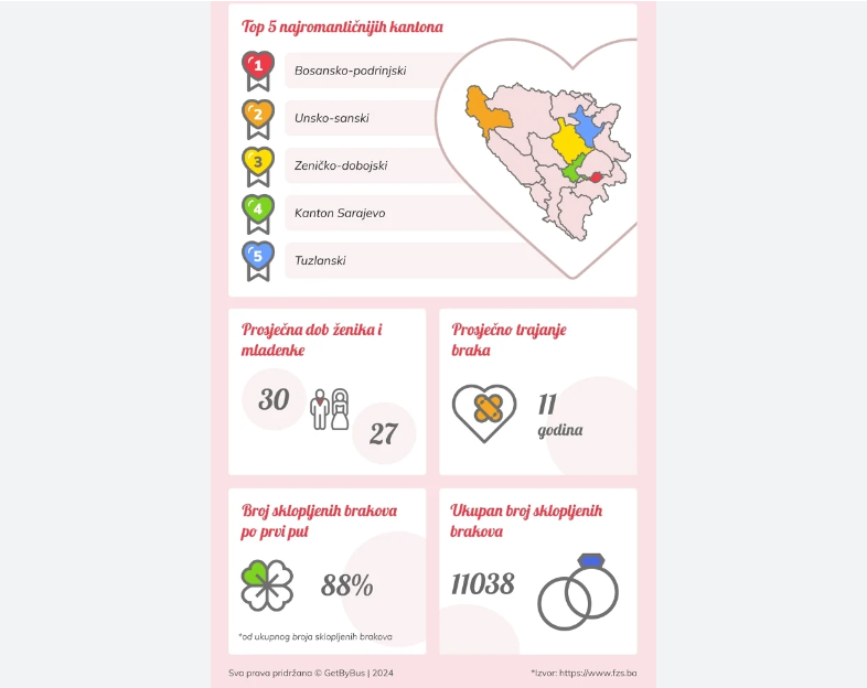 "Kako bismo to doznali koji su to najromantičniji gradovi u Bosni i Hercegovini, napravili smo malo istraživanje u kojim bosanskohercegovačkim gradovima parovi češće stupaju u brak. Odlučili smo kombinirati broj brakova i populacije kako bismo dobili listu najromantičnijih gradova u Bosni i Hercegovini. Za početak uzeli smo u obzir samo gradove preko 20.f000 stanovnika kako bismo dobili realniju sliku", naveli su na stranici Get by Bus.