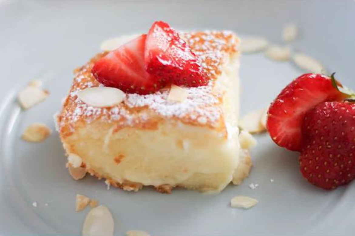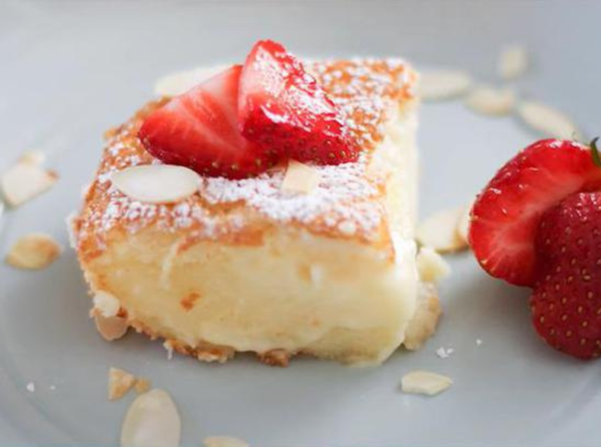 Umućenim žumancima dodaj rastopljeni maslac i vaniliju i miksaj dalje na srednjoj brzini dodatnu minutu, odnosno dok smjesa ne postane jednolična. Dodaj brašno i miksaj na najslabijoj brzini miksera oko 1 minutu. Polako dodaj toplo mlijeko, uz miksanje. Istuci bjelanjke u čvrst snijeg, trebat će ti 3-5 minuta. Polagano snijeg umiješaj u tijesto. Peci kolač 45 minuta na 160 stepeni dok ne dobije zlaćanu koricu, a strane se ne počnu odvajati od kalupa. Ohladi kolač prije rezanja. Posluži s jagodama i posuto šećerom u prahu ili pak s nekim drugim dodatkom poput čokolade, nekog drugog voća, tučenog slatkog vrhnja…