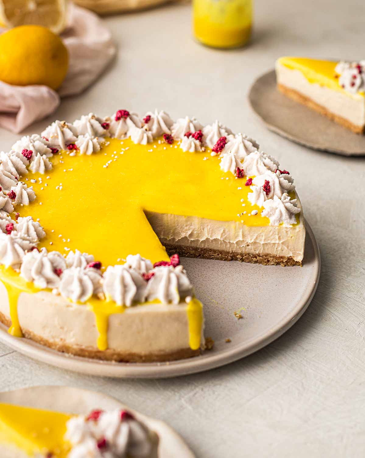 Za prhko tijesto najprije narežite puter na velike komade, a zatim zajedno s preostalim sastojcima zamijesite u posudi glatko tijesto. Zatim pokrijte tijesto te ostavi u frižideru 30-60 minuta. Za smjesu od sira miksajte puter, šećer i ekstrakt vanilije u posudi tri minute. Zatim dodajte jedno po jedno jaje i umiješajte svako jaje u smjesu 20-30 sekundi. U posudu dodajte sok od limuna, sir, jogurt, vrhnje i škrob i sve miješajte dok ne dobijete smjesu bez grudica. Zagrij rernu na 170 Celzijevih stepeni. Lim za pečenje obložite papirom za pečenje i na njega stavite prsten za pečenje.
