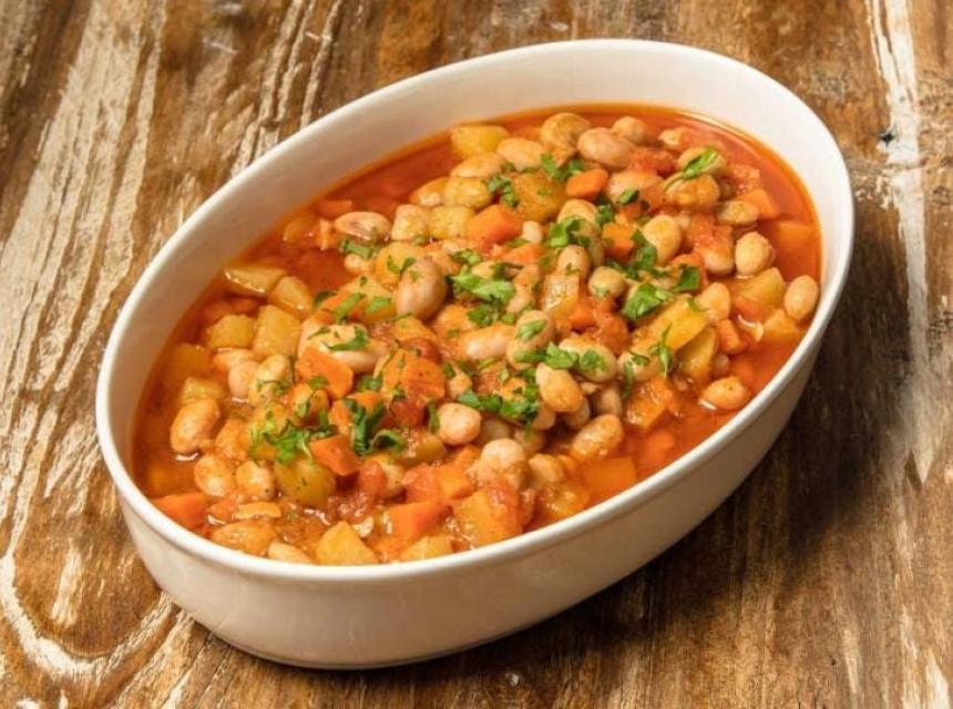 U većoj tavi zagrijte ulje i prepržite mrkvu par minuta pa dodajte luk. Pržite oko pet minuta. Zatim dodajte bijeli luk, paradajz i vruću vodu. Začinite solju, biberom i šećerom i dobro promiješajte. Kad prokuha pustite da kuha desetak minuta pa dodajte kuhani grah i dobro promiješajte.
