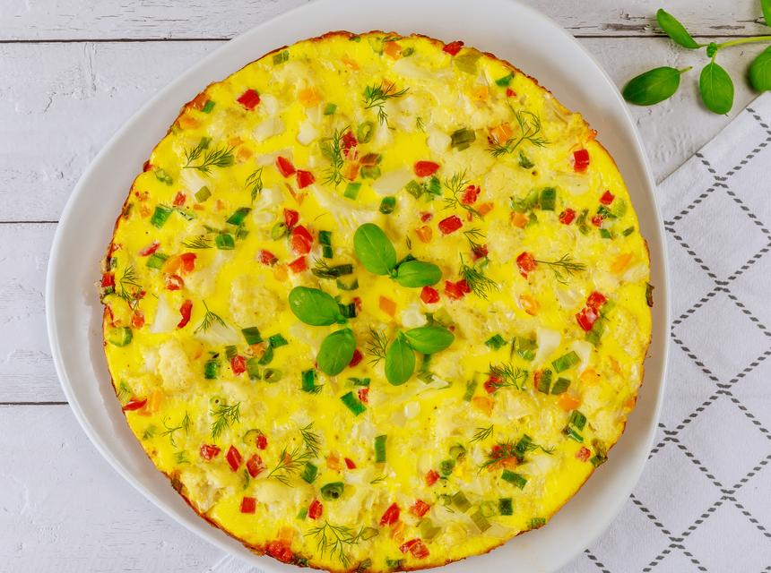 U tavu na zagrijano ulje izlijte četvrtinu pripremljene mješavine sa jajima. Smanjite temperaturu, pospite s dijelom pripremljenog povrća i pecite oko tri minuta.
