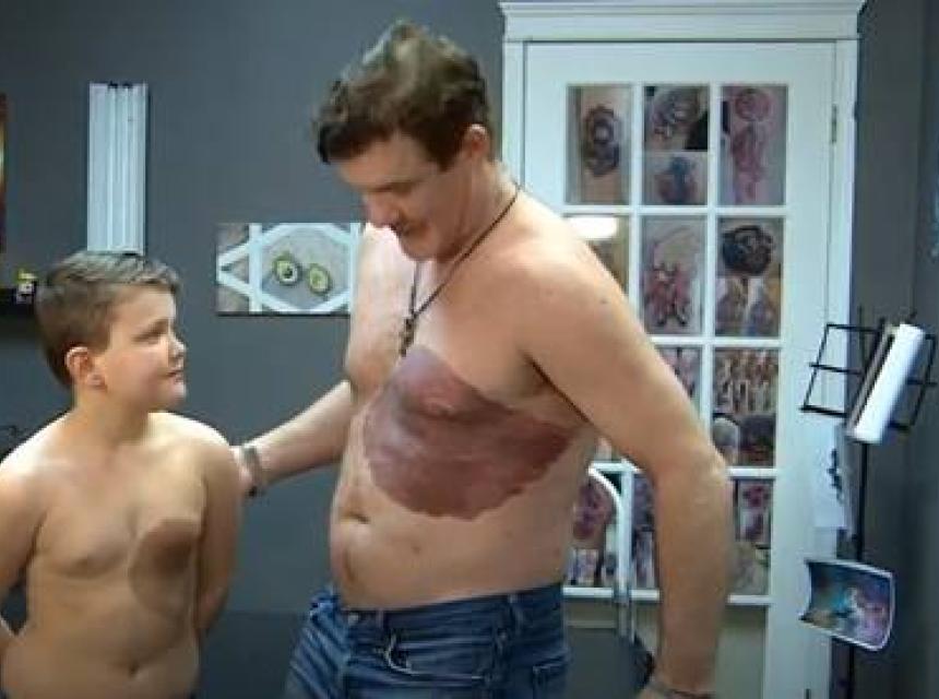 Kanađanin Derek Prue stariji odlučio je napraviti tetovažu kada je vidio da njegov osmogodišnji sin Derek Prue mlađi nije htio skinuti majicu kada je otišao na kupanje.