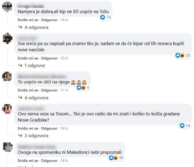 “Namjera je dobra, ali kip ne sliči uopće na Tošu”, napisao je komentator.