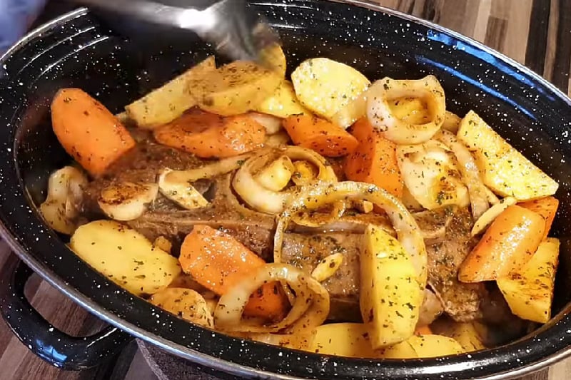Poklopite posudu i ubacite je u hladnu rernu. Temperaturu podesite na 200 stepeni, a podsjetnik navijte na 2 sata. Ukoliko imate vremena možete smanjiti temperaturu na 150 stepeni i produžiti vrijeme pečenja, sigurno ćete poboljšati ukus teletine i povrća.
