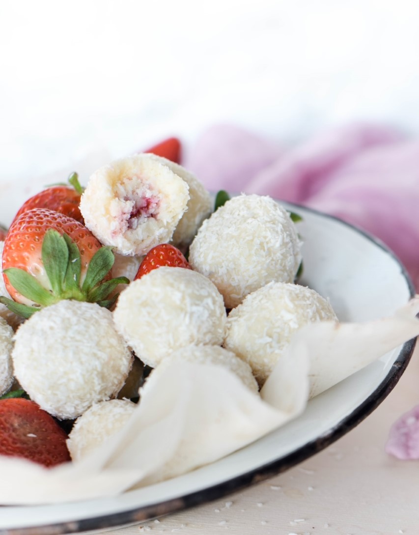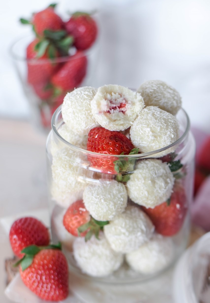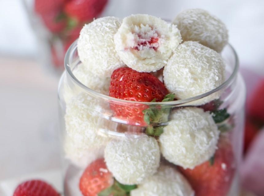 Smjesu ostavite u hladnjaku 1 sat kako biste dobili čvrstu, kompaktnu teksturu. Za to vrijeme jagode narežite na 6 dijelova. Čajnom žličicom zagrabite smjesu, rastanjite i u sredinu stavite komadić jagode. Oblikujte kuglicu i uvaljajte je u kokos. Kuglice stavite u hladnjak te izvadite 10 minuta prije posluživanja kako bi prije konzumiranja malo omekanile.