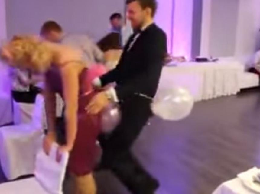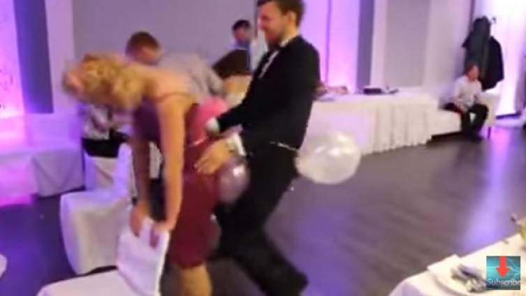 Nismo utvrdili iz koje zemlje potječe snimak, a poenta igre je u tome da su zvanice podijeljene u dvije grupe i da prilikom susreta s ekipama od mlade ili mladoženje moraju puknuti balon.