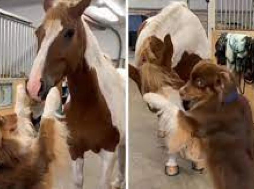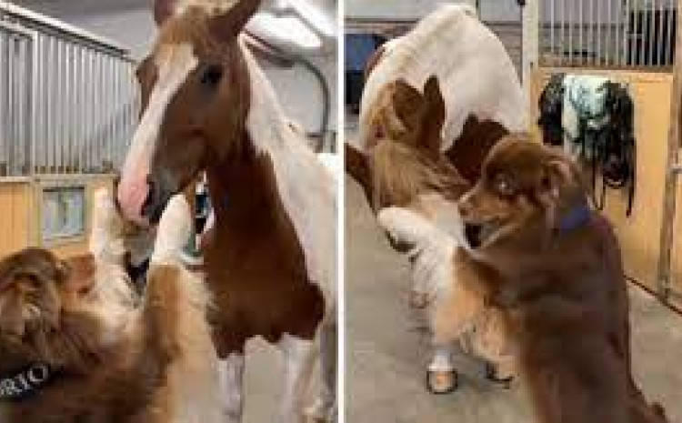 Pas nije mogao sakriti uzbuđenje kada se susreo s konjem. Došao je pred konja, stao na dvije šape i krenuo ga grliti.