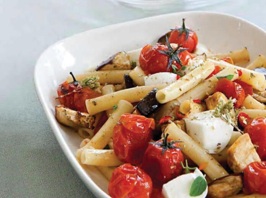 PRIPREMA: Patlidžan izrezati na kocke, posoliti, preliti uljem i prstima dobro promiješati; paradajz posoliti i preliti uljem, te sve staviti u veliku tepsiju prekrivenu papirom za pečenje. Peći 10-ak minuta, prebaciti u zdjelu, dodati fino isjeckanu papriku i posuti origanom. Tjesteninu skuhati al dente u slanoj vodi, procijediti, kratko staviti pod hladnu vodu, dobro procijediti i pomiješati sa povrćem. Preliti maslinovim uljem, dodati izrezanu mozzarellu, promiješati i odmah poslužiti