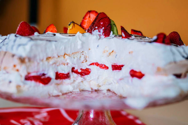 Beze koru premažite šlagom i po njoj rasporedite narezano voće. Prije posluživanja neka malo odstoji u hladnjaku.