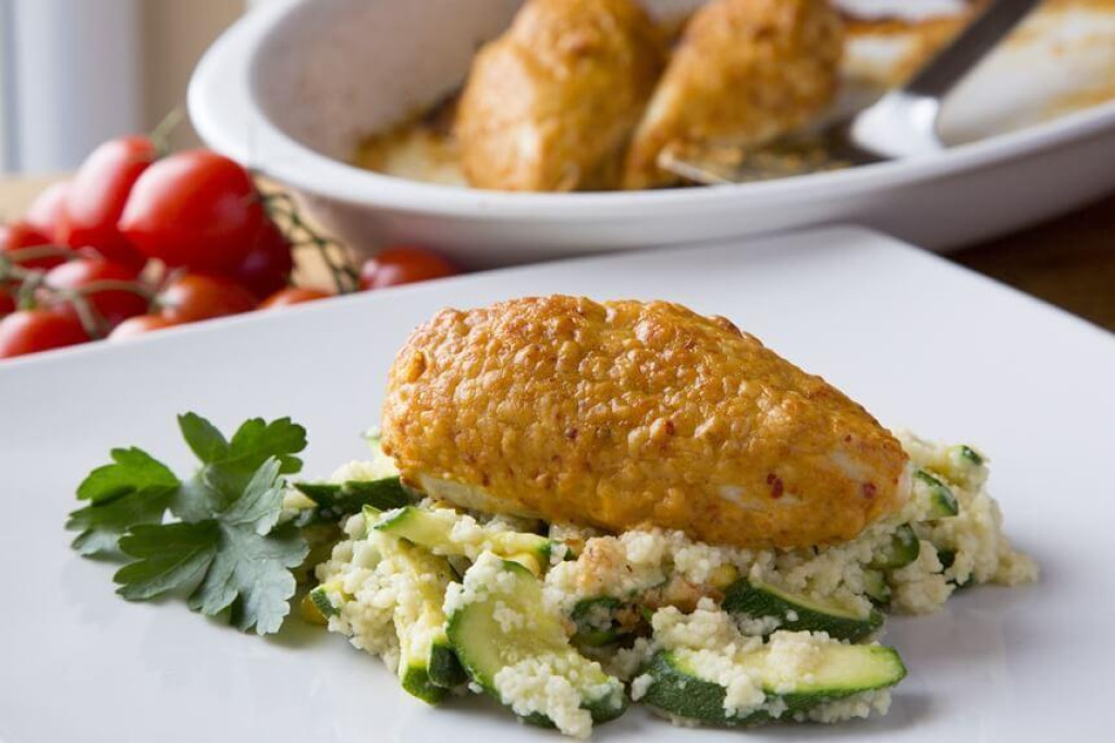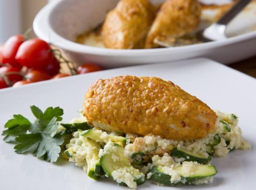 U tavu s tikvicama dodamo na listiće narezan bijeli luk i kukuruz iz konzerve, sve posipamo s malo kus-kusa, ulijemo povrtnu juhu i povremeno miješamo. Na tanjire stavimo tikvice s kus-kusom, a preko tikvica stavimo pečeni file piletine. Jelo ukrasimo listićima svježeg peršuna.