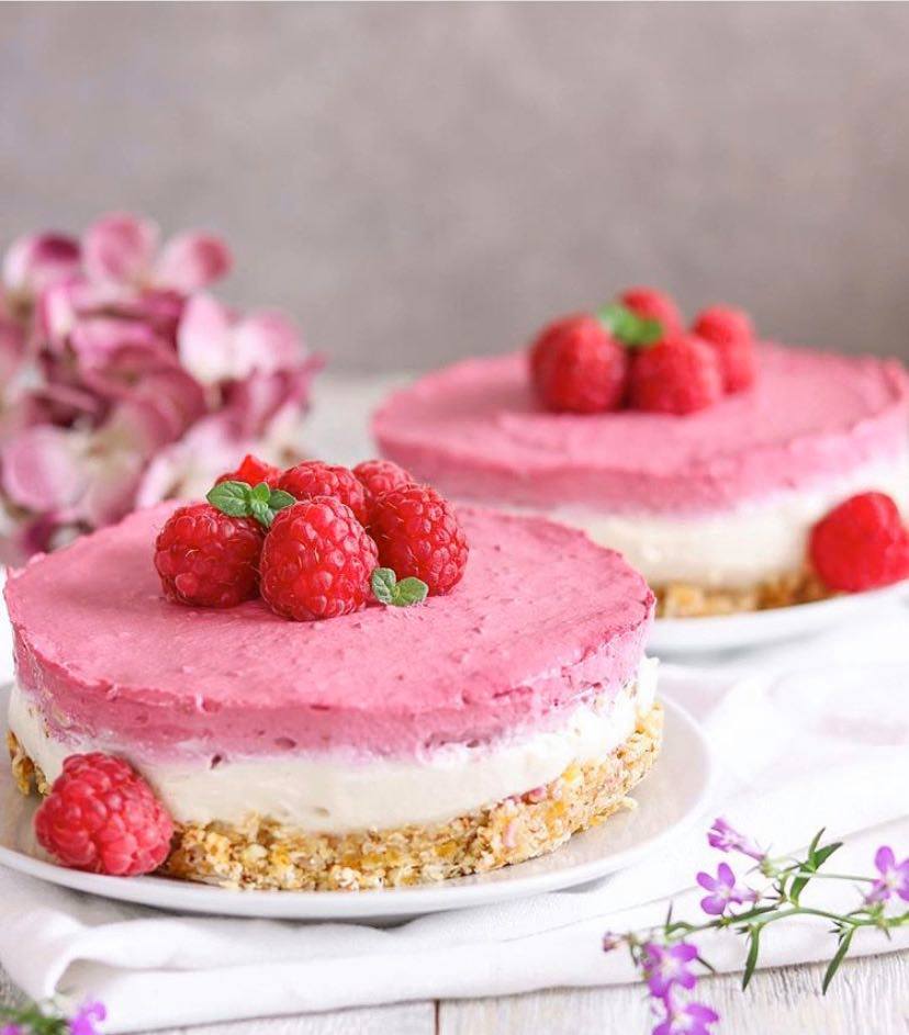 Mljevenim keksima dodajte rastopljeni maslac i med. Smjesu ubacite u kalup i jednolično rasporedite. Pomiješajte sir i šećer u prahu, dodajte izmiksano slatko vrhnje, limunov sok i vrećicu želatine. Kako biste postigli pink efekt malo voća izblendajte i dodajte u bijelu kremu kako bi je obojali omiljenom pink bojom i to posve prirodno. Dobivenu kremu rasporedite na podlogu od keksa. Ostavite u hladnjaku 30 minuta da se krema stisne, ali i kako ne bi došlo do pucanja površine.