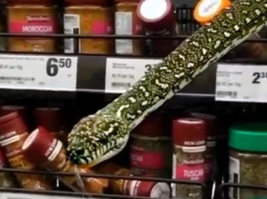 Neobična scena u supermarketu Woolworths na periferiji grada okončana je sretno jer je Alati spasilac divljih životinja i dobro poznaje zmije.