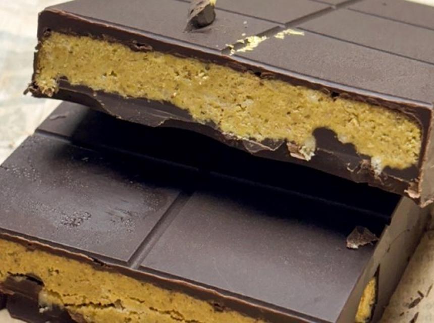 U drugoj posudi lagano zagrijte kremu od pistacije pa ju pomiješajte s kadaifom. Smjesom pistacije i kadaifa sada napunite kalup u koji ste stavili čokoladu, prelijte s još čokolade i stavite u hladnjak kako bi se čokolada stegnula, a zatim je poslužite.