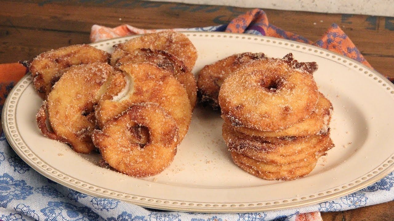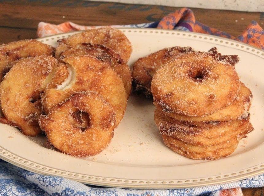 Sastojci: 5 velikih jabuka, 5 kašika šećera, 1 vanilin šećer, brašno za pohovanje, kašičica cimeta, mlijeko, jaje, korica limuna, 2 kašike ruma, malo mlijeka, ulje.