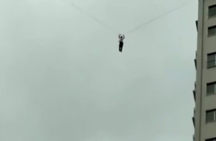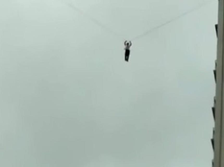 Međutim, precijenio je svoje akrobatske mogućnosti. Na snimci se vidi kako visi s visine od 60 metara i jedva se drži za kabel. Na sreću, policija je uz pomoć vatrogasaca uspjela reagirati na vrijeme.