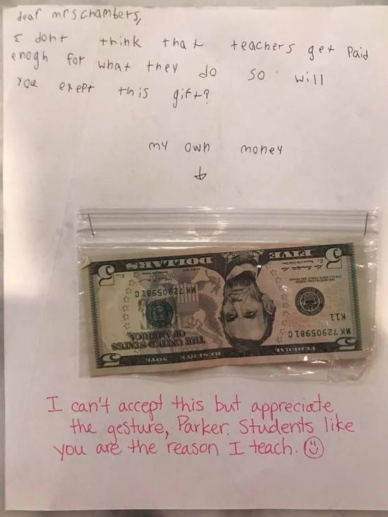 "Poštovana gospođo Chambers, mislim da nastavnici nisu dovoljno plaćeni za ono što rade, hoćete li prihvatiti ovaj poklon?"