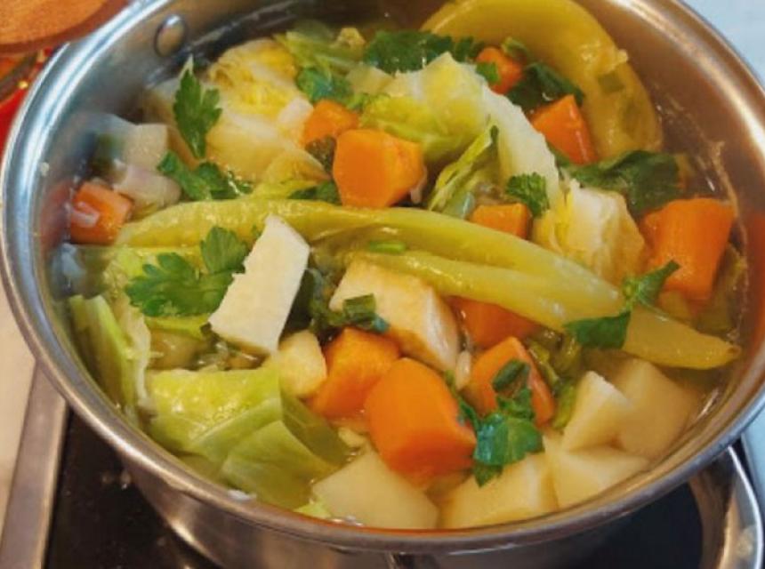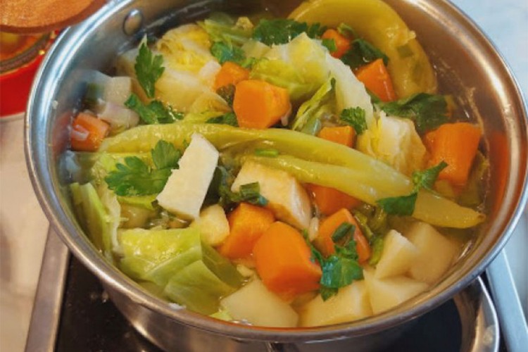 U sredinu staviti krompir, mrkvu, kocke celera i lista, mladi luk i zelenu papriku.