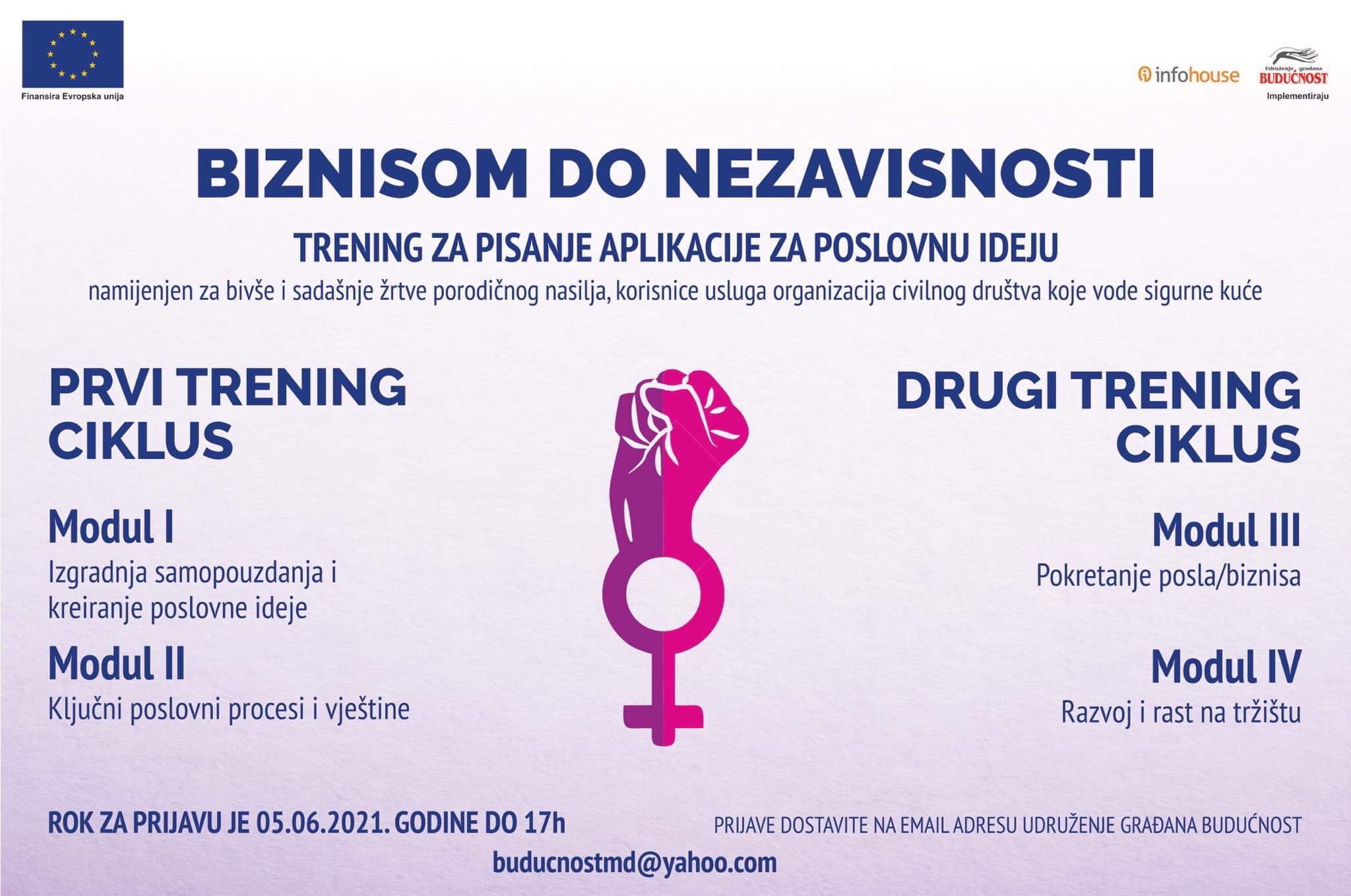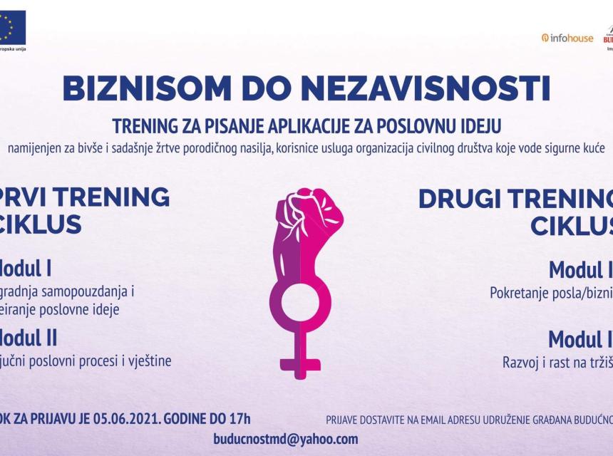 Fondacija “INFOHOUSE” iz Sarajeva i Udruženje građana “Budućnost” iz Modriče pozivaju žene, žrtve nasilja da se do 5.6.2021. prijave na trening “Biznisom do nezavisnosti: Obuka za pisanje aplikacije za poslovnu ideju”, čija realizacija će biti tijekom juna u okviru projekta koji ove organizacije implementiraju uz podršku Evropske unije “Ekonomske i socijalne prilike ka nezavisnosti žena, žrtava nasilja u porodici”.