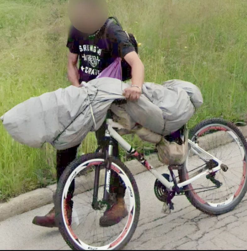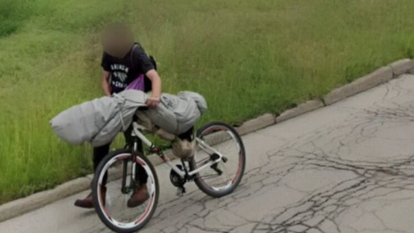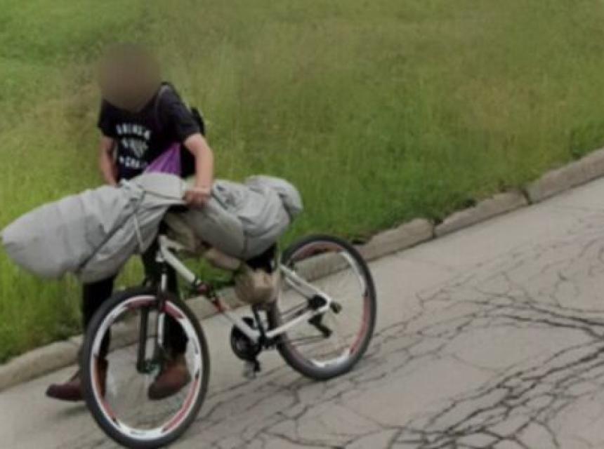 Zapanjujuće slike koje je snimila Google kamera u Ohaju prikazuju čovjeka koji gura bicikl uz ivicu puta s prebačenom sivom ceradom.