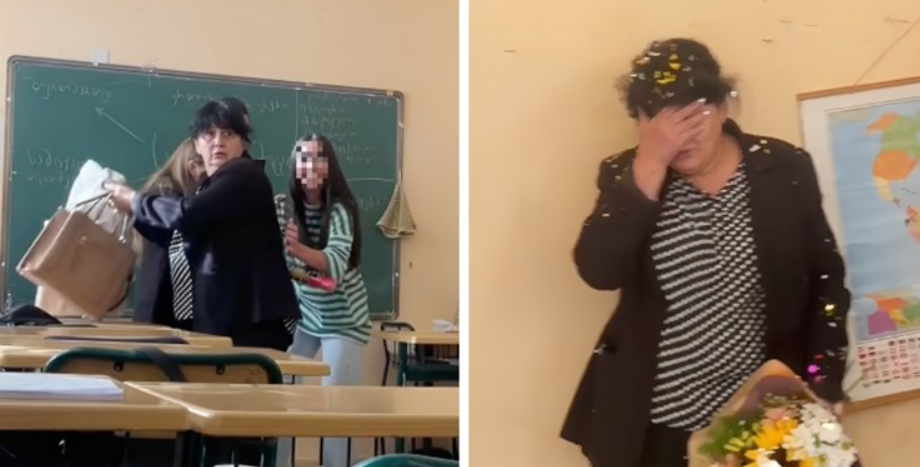 Kad su se dječaci razmaknuli, jedan joj je pružio buket, a u zrak su poletjele konfete. Složni učenici poželjeli su omiljenoj nastavnici sretan rođendan, a ona je svojim gestama jasno pokazala da je u potpunom šoku.