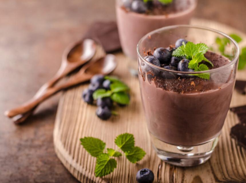 Čokoladni chia puding poslužite s jogurtom po želji i borovnicama, komadićima breskve ili kakvog drugog voća.
