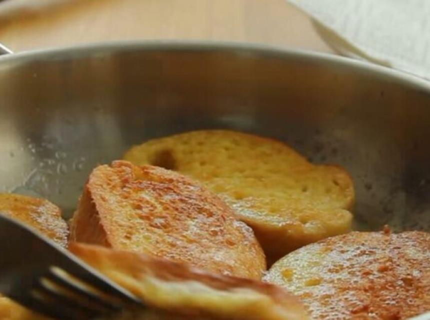 Iseći stari hljeb na kriške i uvaljati ga u masu, pa pržiti na vrelom ulju.