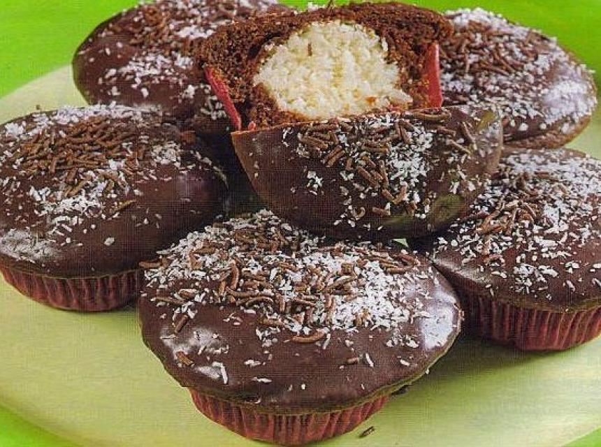 U sud za mućenje stavite mliječni namaz, vanilin šećer, šećer u prahu i mutite mikserom dok se sastojci ne sjedine. Dodajte kokosovo brašno i promiješajte. Od smjese rukama formirajte kuglice. U udubljenja u kalupu za mafine stavite papirne korpice. U sud s brašnom dodajte prašak za pecivo, kakao i promiješajte. U sud za mućenje dodajte jaje, 80 grama putera i izmutite mikserom. Zatim dodajte šećer, jogurt i mutite dok se sastojci ne sjedine. Dodajte brašno s kakaom i praškom za pecivo i miješajte kašikom dok se sastojci ne sjedine.